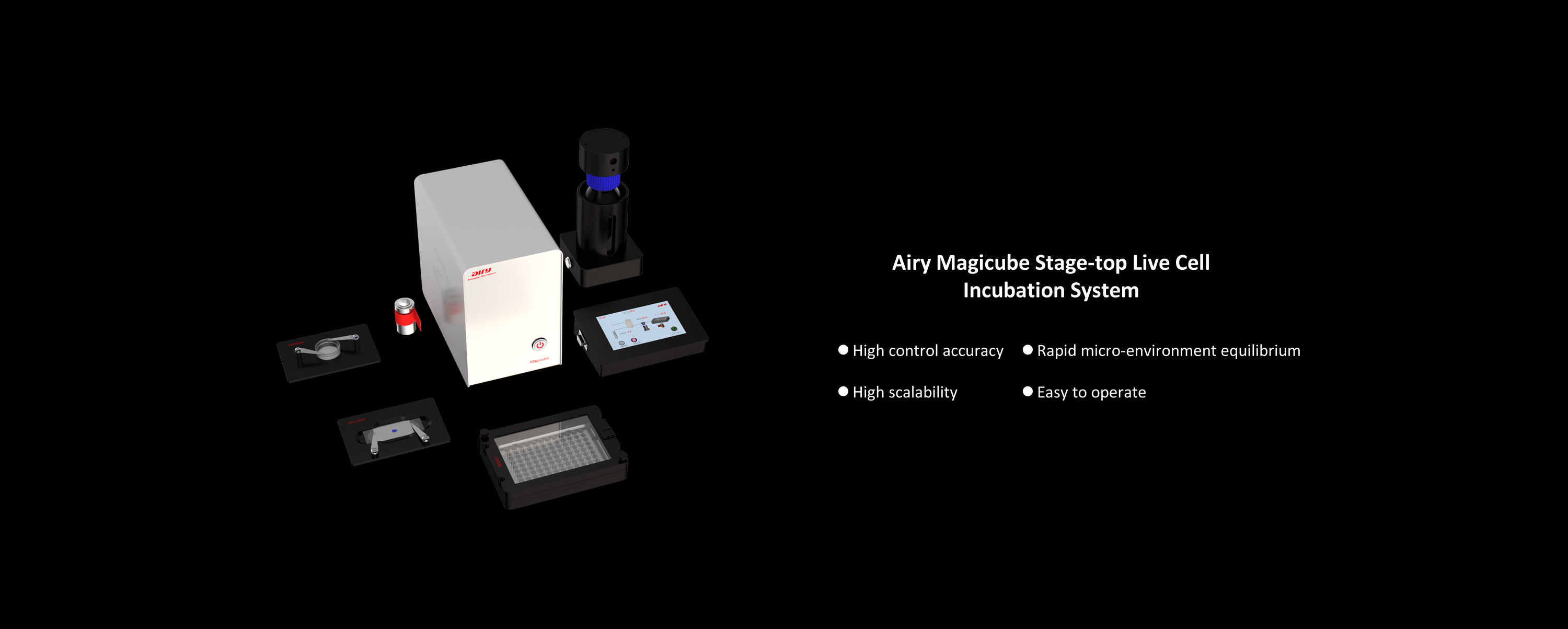 The MagiCube stage-top live cell incubation system is a support solution for long-term live cell imaging launched by Airy Technologies, which has the characteristics of high control accuracy, fast microenvironment balance, high scalability, and easy operation.
